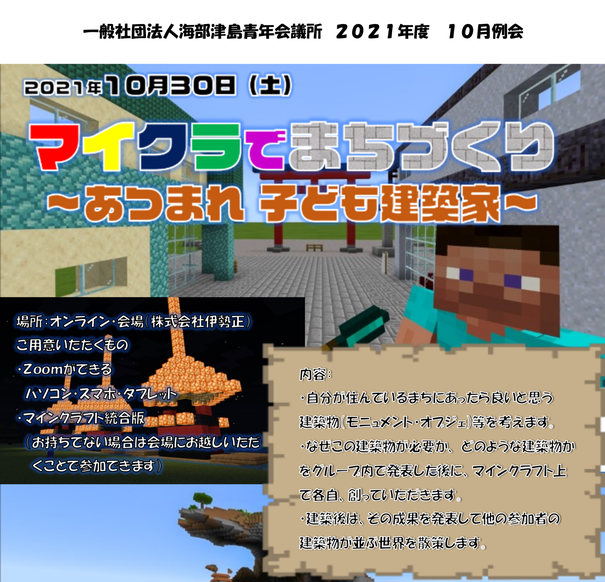 当日は、Zoomとマインクラフト(統合版)を使用する予定です。Zoomは無料でダウンロードできますが、マインクラフトは有料です。マインクラフトを保有されていない場合には、チラシ記載の会場にて参加していただくことも可能です。