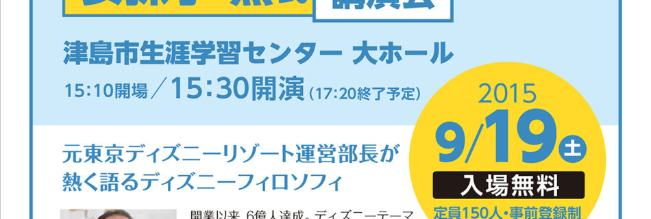 ディズニーランド 本気のブランディング 安孫子薫氏講演会 日時・・・9/19(土) 15:10開場 15:30開演 場所・・・津島市生涯学習センター大ホール ※入場無料 定員150名 元東京ディズニーリゾート運営部長が熱 …