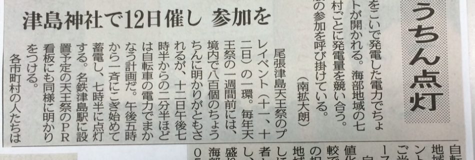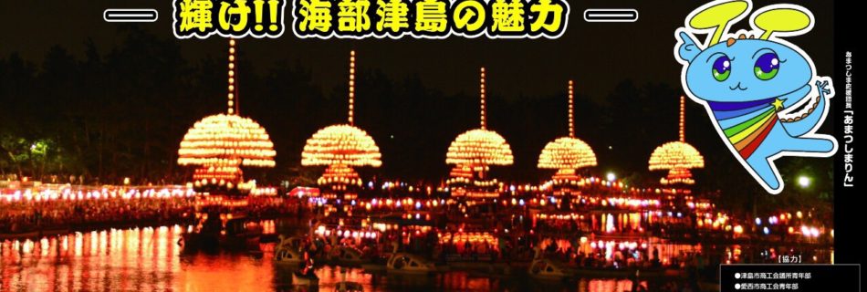 日時・・・7月12日(日)17:00~20:00 場所・・・津島神社南門 「海部津島の魅力大集合」 7行政区の魅力が津島神社に一同に会す!! 「漕いで漕いで自家発電!海部津島に光を灯せ!」 800個の献灯提灯と海部津島パ …