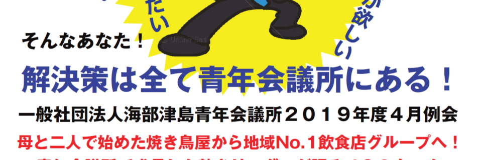 2019年4月23日(火)19:30~20:45 (一社)海部津島青年会議所が異業種交流会を開催します。参加者同士の名刺交換をはじめ、事業承継についても学べる交流会になっております。講師には当青年会議所のOBであり、今や …