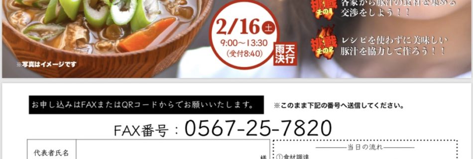 定員に達したため、応募を締め切りさせていただきました。 たくさんのご応募ありがとうございました!! 2月例会(地域をつなげ!熱い豚汁!) 開催日:2019年2月16日(土) 時 間:9:00~14:30(受 …